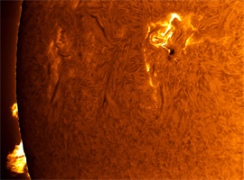 왼쪽 위에서는 태양 표면 위로 장대하게 솟아올라와 있는 홍염이 보입니다.
