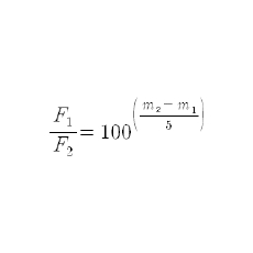 사람의 눈은 외부에서 주어지는 빛의 자극에 대하여 로그함수적으로 반응합니다. 예를 들어 세 천체 A, B, C의 플럭스 밀도의 비가 1:10:100이라고 할 때, B는 C보다 10배 더 밝고, A도 B보다 10배 더 밝습니다. 하지만, 우리의 눈은 B와 C의 밝기 차이와 A와 B의 밝기 차이가 같다고 인식합니다. 다시 말해, 자연계에서는 배수로 표현되는 것이 우리 눈으로는 차이로 인식되는 것입니다. 배수를 차이로 변환해주는 함수는 로그함수입니다. 기원전 2세기 경 히파르코스(Hipparchos)는 별들의 밝기를 눈에 보이는 그대로 순서를 매겨서 6 등...