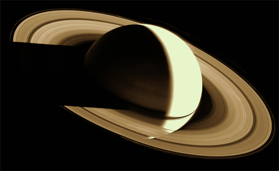 보이저 1호가 토성에 도착한 이틀 뒤에 뒤를 돌아보며 촬영한 영상입니다. 5백만 km 이상 떨어진 곳에서 촬영한 것입니다. 지구상에 설치된 망원경으로는 볼 수 없었던 모습입니다. 지구는 태양에 너무 바짝 붙어 있기 때문에 토성의 그늘진 면을 볼 수 없기 때문입니다.