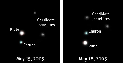 마크 부이(로웰 천문대)는 2002년에 허블 우주 망원경을 이용하여 명왕성을 촬영한 바 있습니다. 부이가 이 영상에서 위성들의 존재를 확인함에 따라 이들이 명왕성의 위성이라는 점을 확신할 수 있었습니다. 이 때가 10월 말입니다.