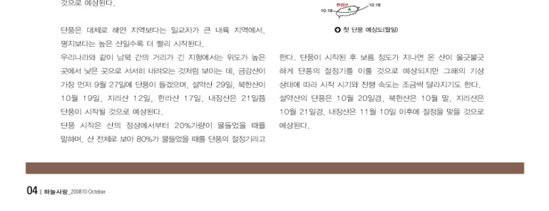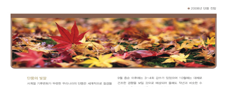 기상청은 2008년의 단풍 전망을 다음과 같이 발표하였습니다. 기사는 기상청 월간 정책지 "하늘사랑" 10월호에서 뽑은 것입니다.