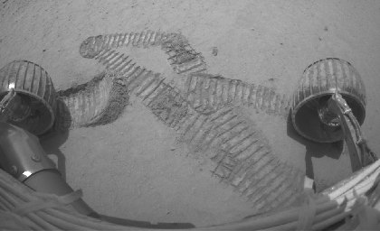 이 애니메이션은 스피릿의 전방 위험 회피용 카메라(front hazard-avoidance camera)로 찍은 것입니다. 화성에서 이 지점의 반대편에 착륙한 오퍼튜니티도 비슷한 작동을 통해 자국을 만들었는데, 앞뒤로 여섯번만 움직였는데도 10cm 깊이의 자국이 만들어졌습니다. 오퍼튜니티가 착륙한 지점(Meridiani Planum)의 토양이 이보다 어설프게 결합되어 있다는 것을 암시합니다. (스피릿은 Gusev Crater에서, 오퍼튜니티는 Meridiani Planum에서 작업중 ^^)