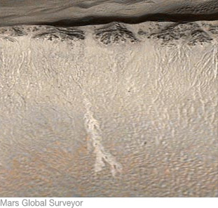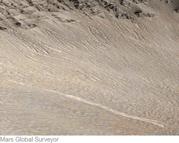 화성의 표면에서 물이 흐르면서 퇴적물이 이동하여 퇴적된 모습의 영상입니다.