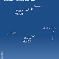 3월 23일 초저녁에 서쪽 지평선 근처에서 실낱같이 가는 달을 보셨을 거에요. 그리고 그 위에 아주 밝은 볼 수 있었죠. 이 밝은 별이 금성입니다. 그림에서 보시...