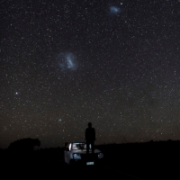 남반구의 밤하늘 사진입니다. 탐사대의 차량 위에 선 김시영 님의 머리 위로 보이는 뿌연 것이 대마젤란은하(아래의 큰 것)와 소마젤란은하입니다. 대마젤란 바로 아래에 별이 옹기종기 모여 있는 것은 산개성단 NGC 2516입니다. 성단의 왼쪽 위에 있는 밝은 ...