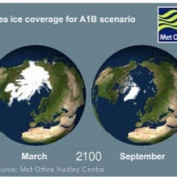 Hadley Center의 Met Office가 기후 변화에 대한 A1B 모형을 이용하여 예견한 2100년의 북극해의 빙하 분포입니다. 다음은 2007년의 빙하 분포입니다. 같은 모형 실험 결과에서 얻어졌으며 실제 자료를 반영한 것입니다. 플래시 애니메이션 : http://www.metof... -
