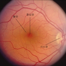 정상적인 사람의 망막은 다음과 같습니다. 오른쪽에 밝게 보이는 부분은 시신경이 지나가는 지점 즉, 왼쪽의 붉은 부분은 중심와, 중심와를 둘러싼 노란 부분은 ...