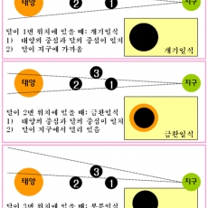 달의 위치에 따라 어떤 일식이 발생하는지 보겠습니다. 아래 그림에서 태양은 노랑, 지구는 연두, 달은 검정으로 표현되어 있습니다. 이 그림의 위쪽이 황도의 북...