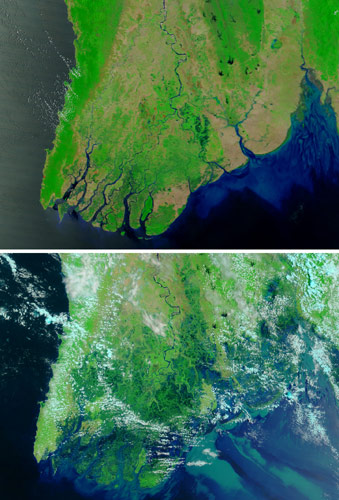 2008년 5월 2일과 3일에 미얀마(버어마) 남부를 강타한 싸이클론으로 인해 이 지역은 철저하게 파괴되었습니다. 이 영상은 해당 지역을 NASA의 Terra 위성이 촬영한 것입니다. 위 것은 2008년 4월 15일, 아랫 것은 5월 5일에 촬영한 것입니다.