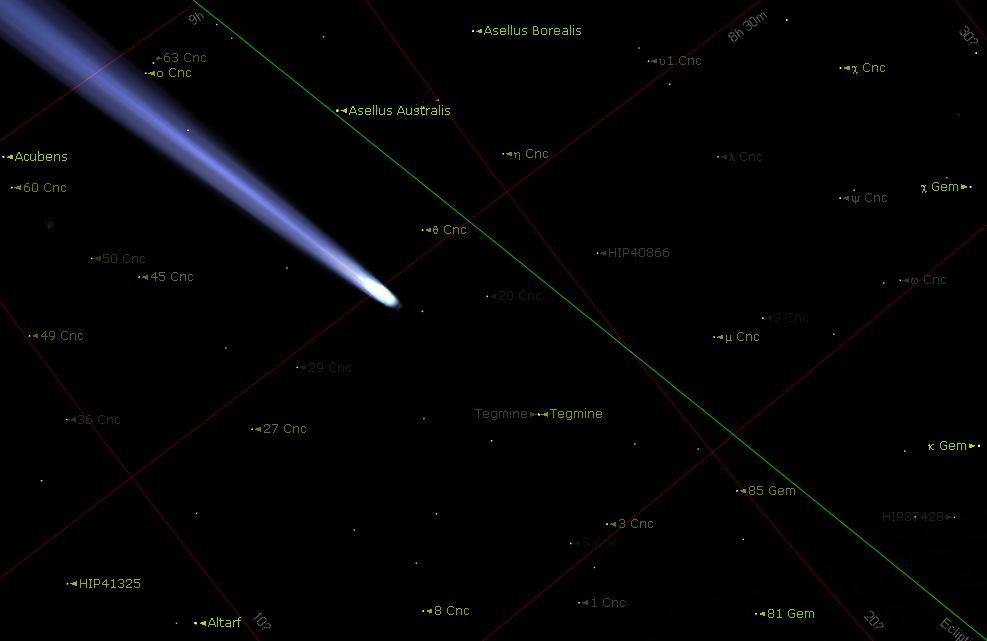 아래 그림에서는 혜성이 그냥 점으로 표시되어 있습니다. 혜성의 핵이죠. 25Cnc 왼쪽에 있는 점이 혜성입니다.