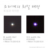 토성과 타이탄입니다. 2008년 3월 14일 { 70-200이 아니라 80-200입니다 } 사진기를 망원경 등에 업어서 찍은 사진입니다. 노출 시간은 잘 모르겠습니다. 60초 쯤 주었나 모르겠네요.. 확인해보니 11등급까지 찍혔네요.. 토성이랑 타이탄인데요,, 상현달 근처... -